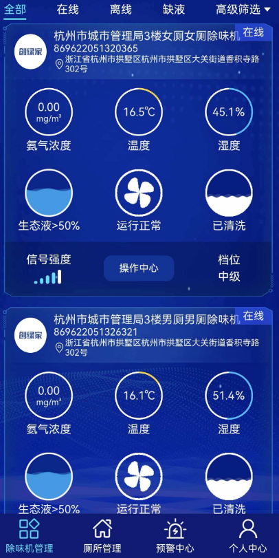 更懂管理痛点的是,设备采用高频振荡雾化技术,精准覆盖每一处异味角落,无需人工手动操作,全程自动运行;搭配4G联网功能,支持远程监控、智能预警,管理者足不出户就能掌握设备运行状态,异味超标自动加码处理,彻底告别“人工盯守+高频打扫”的低效模式,大幅降低人力与运维成本。