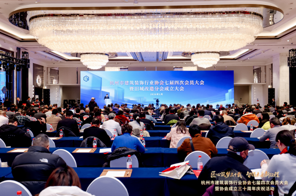2026年1月21日,杭州市建筑装饰行业协会七届四次会员大会暨旧城改造分会成立大会在杭州黄龙饭店隆重召开。本次大会以“匠心筑梦三十载 智领未来新征程”为核心主题,汇聚了行业主管部门领导、协会负责人、会员单位代表及行业专家学者,共商杭州建筑装饰行业高质量发展大计,见证旧城改造领域开启全新发展篇章。